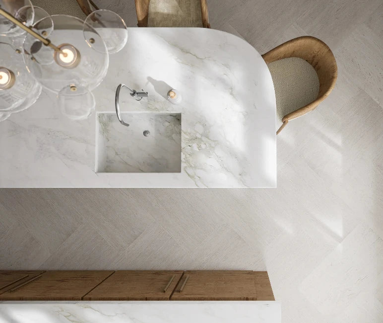 Birch White Travertine features chalky-white overtones and dark taupe undertones, with a filled surface that seamlessly integrates the organic pits, deposits, and occasional fossils typical of natural travertines, resulting in a more even finish. The vein-cutting process unveils unique patterns reminiscent of wood planking, offering a sophisticated yet lightly rustic aesthetic.