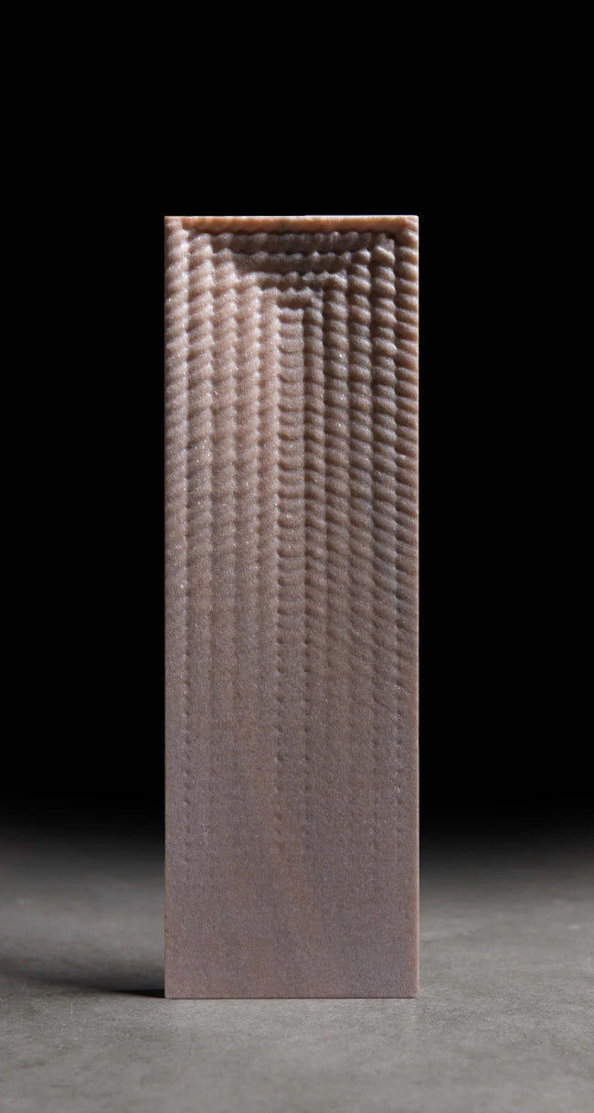 Fade reflects the inherent beauty in the steady passing of time, expressed in a gentle transition from one state to another. On one side, its highly textured design stands out crisply, but softly fades as it travels across the stone, relaxing into smooth natural stone on the other. Part of the Phases collection by stone artist and designer Ruchika Grover, Fade showcases the organic allure of natural stone and depth created through texture. Fade is stocked as 4"x12" tiles in Coral Pink and Green Serpentine.