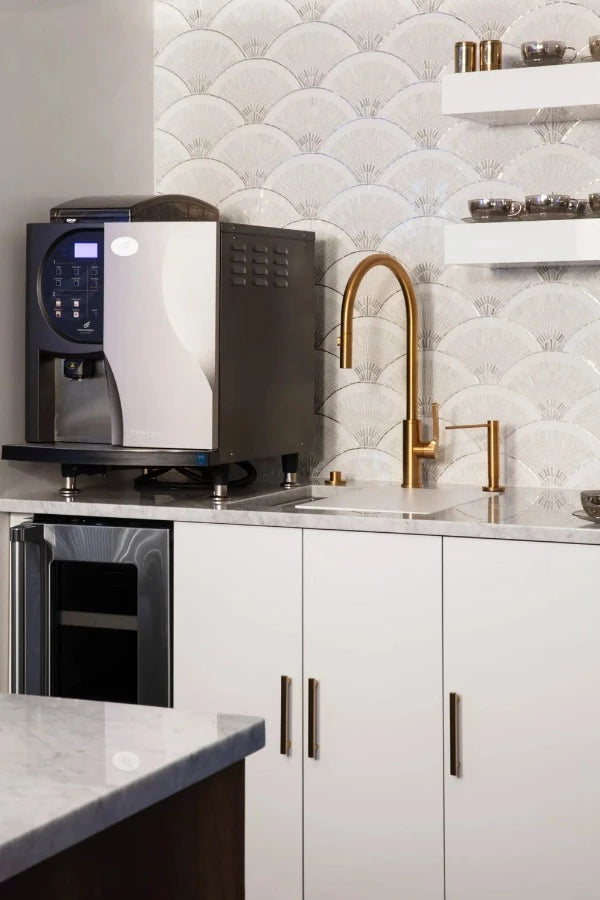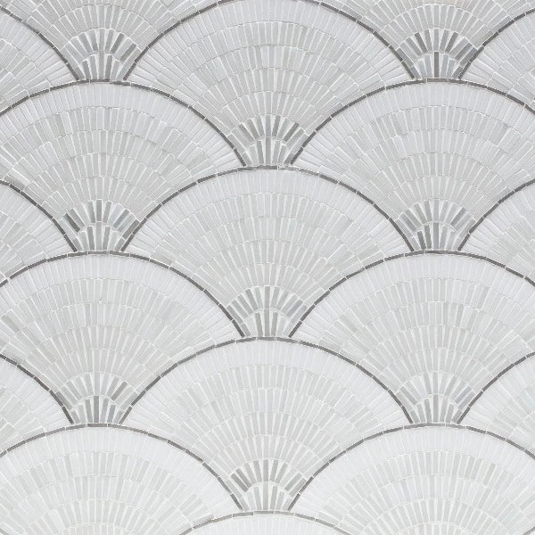 Fan Club takes a pattern from antiquity and forges it from dazzling Jazz Glass, adding an artistic Glass mosaic flair to a familiar motif. Stocked in a refined solid Ice White, a stunning Blue Ombre with brushed Brass, and a warm Cream Ombre with brushed Brass. The pattern in each colorway is truly special - tasteful, timeless, and thoroughly unique.