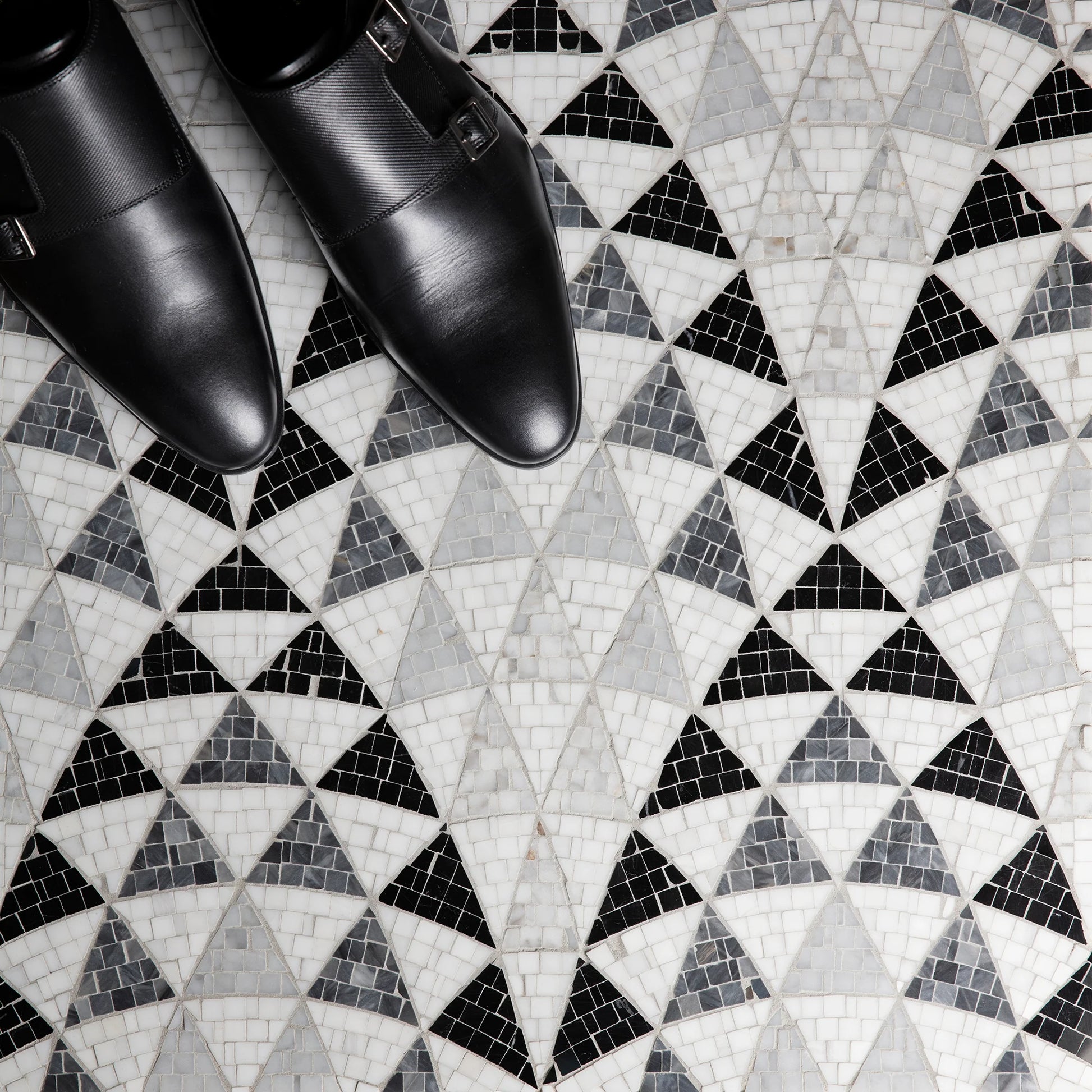 Grand Hotel presents a modern rendition of a classic mosaic pattern, in fine hand-worked tesserae. Crafted from classic materials including Bianco Dolomiti, Bardiglio Nuvolato, Bianco Carrara, China Black, and Statuary, the pattern pays homage to the Grand hotels of Italy. Stocked in 10" X 10 ¾" Interlocking Sheets.