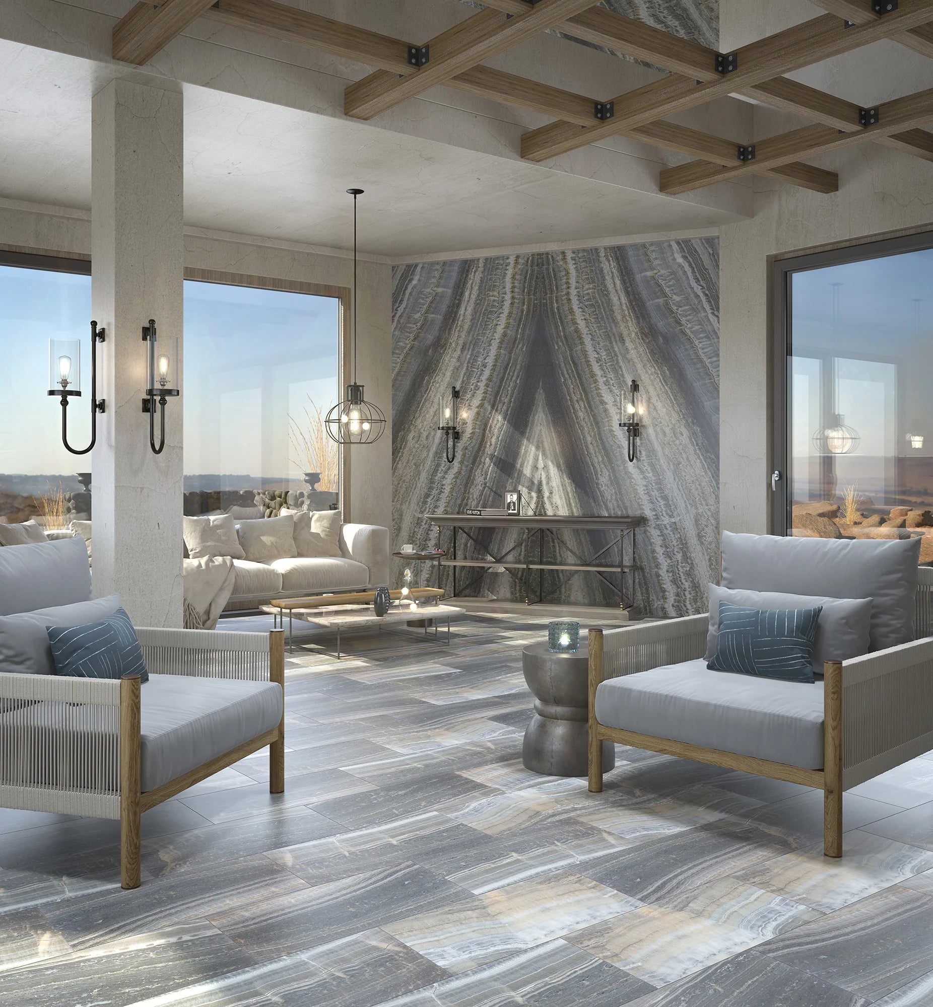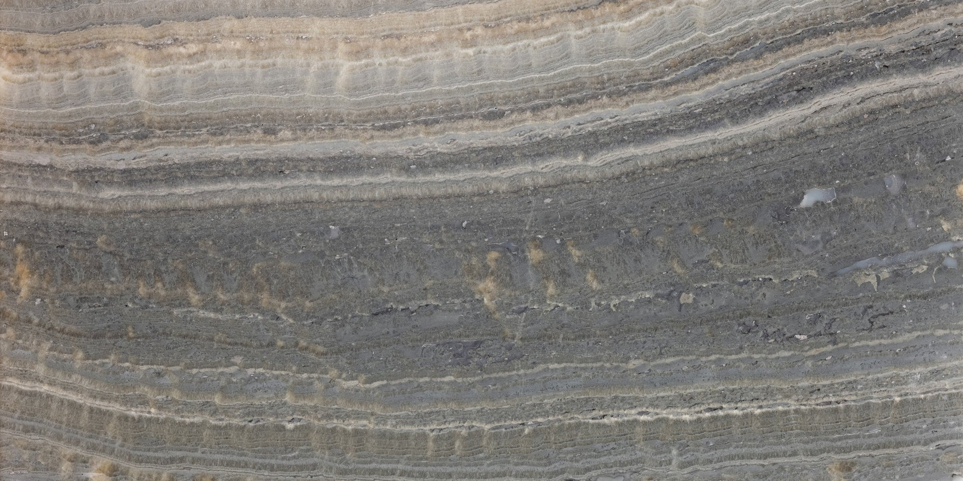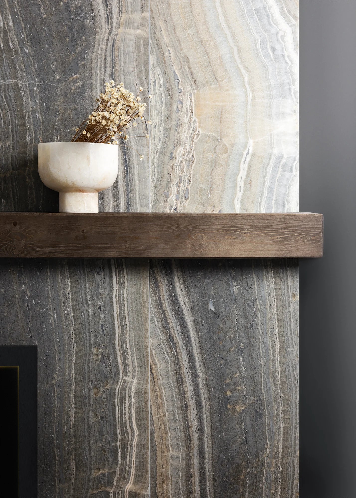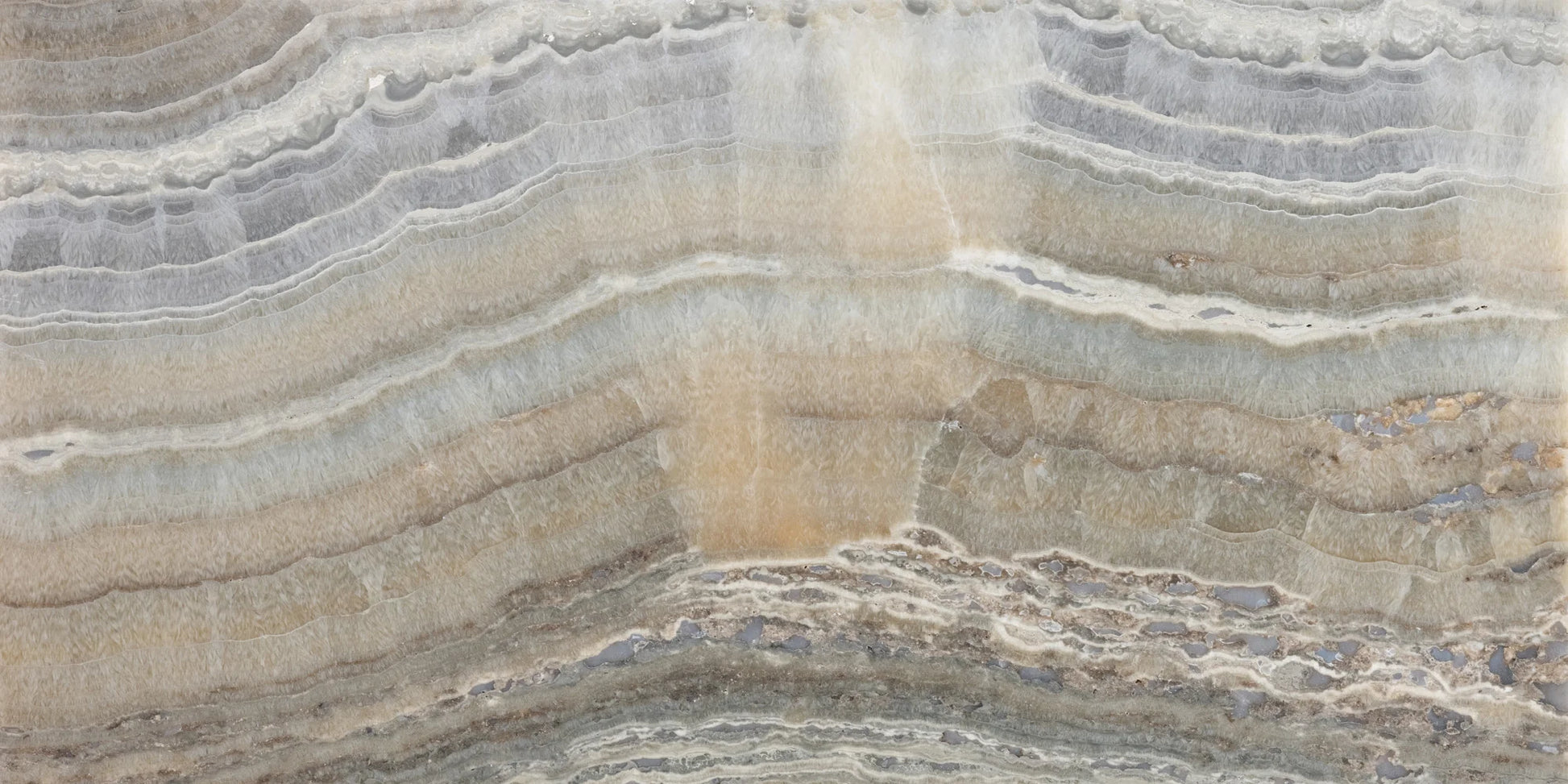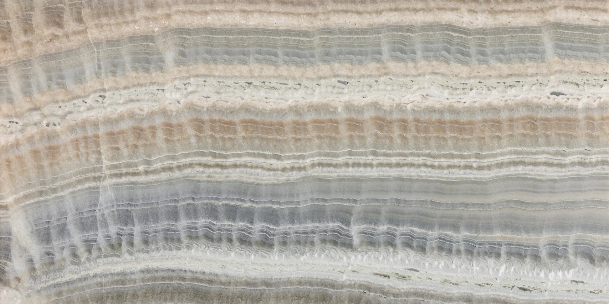 A majestic onyx, specially cut from the block to show off ribbons of rich, translucent color ranging from gold to silver to deep blue-grey. The interaction of warm and cool tones, and the inherent drama in the veining make this stone ideal for both vertical and horizontal use. Grey Onyx is stocked in 2cm, polished slabs and honed 12" × 24" field tile.