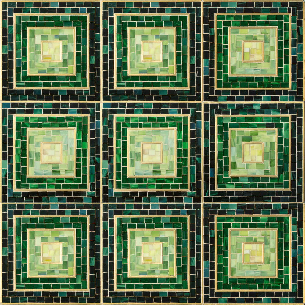 Like the repeating squares of a step pyramid or the pooling terraces of a cascading fountain, Hip 2B Square presents an Ombre Jazz Glass mosaic in a different dimension, with Light Blue or Green Glass squares stepping down to Dark Blue or Green, each area outlined in Brass. The style feels a bit retro, a bit contemporary, and overall totally unique.