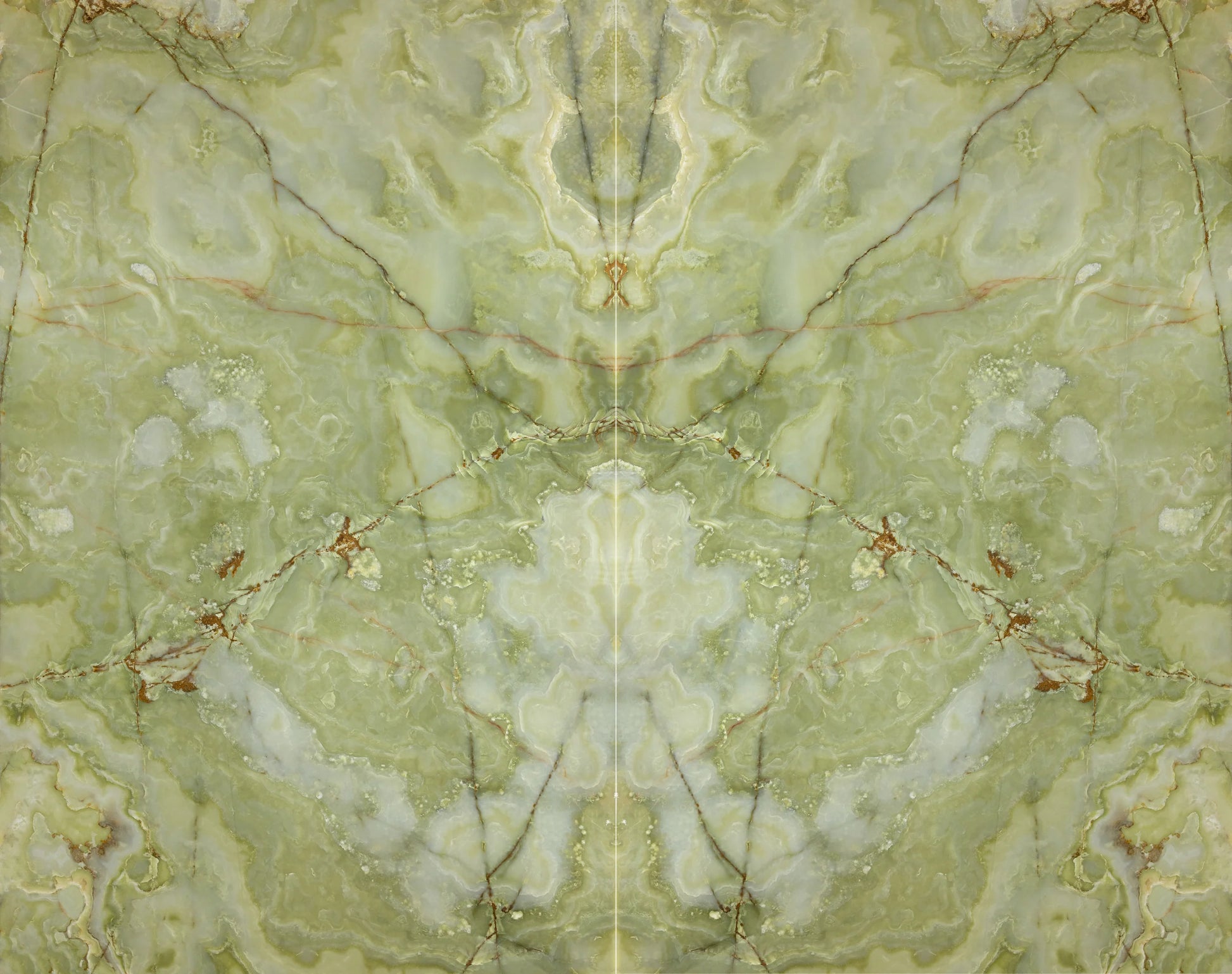 Translucent color pools with an exquisite flow in this highly prized onyx quarried in Afghanistan. On a ground of shifting greens that vary from pale pistachio to key lime to peridot, veins of blood orange, rose gold and terracotta seem to float across the surface and then dip into the depths of the stone itself. Offered in 3/4” (2cm nominal) polished slab.