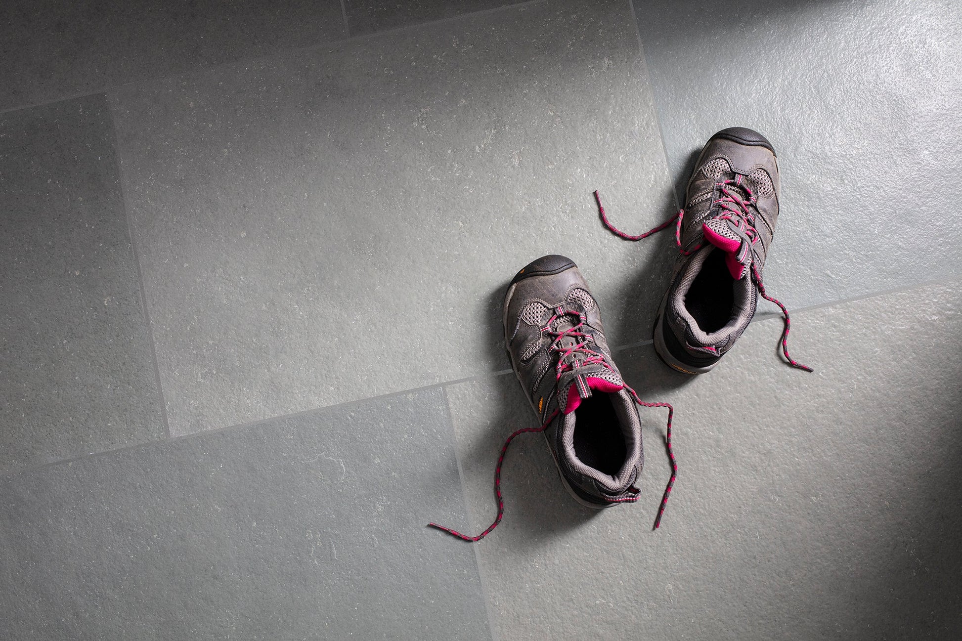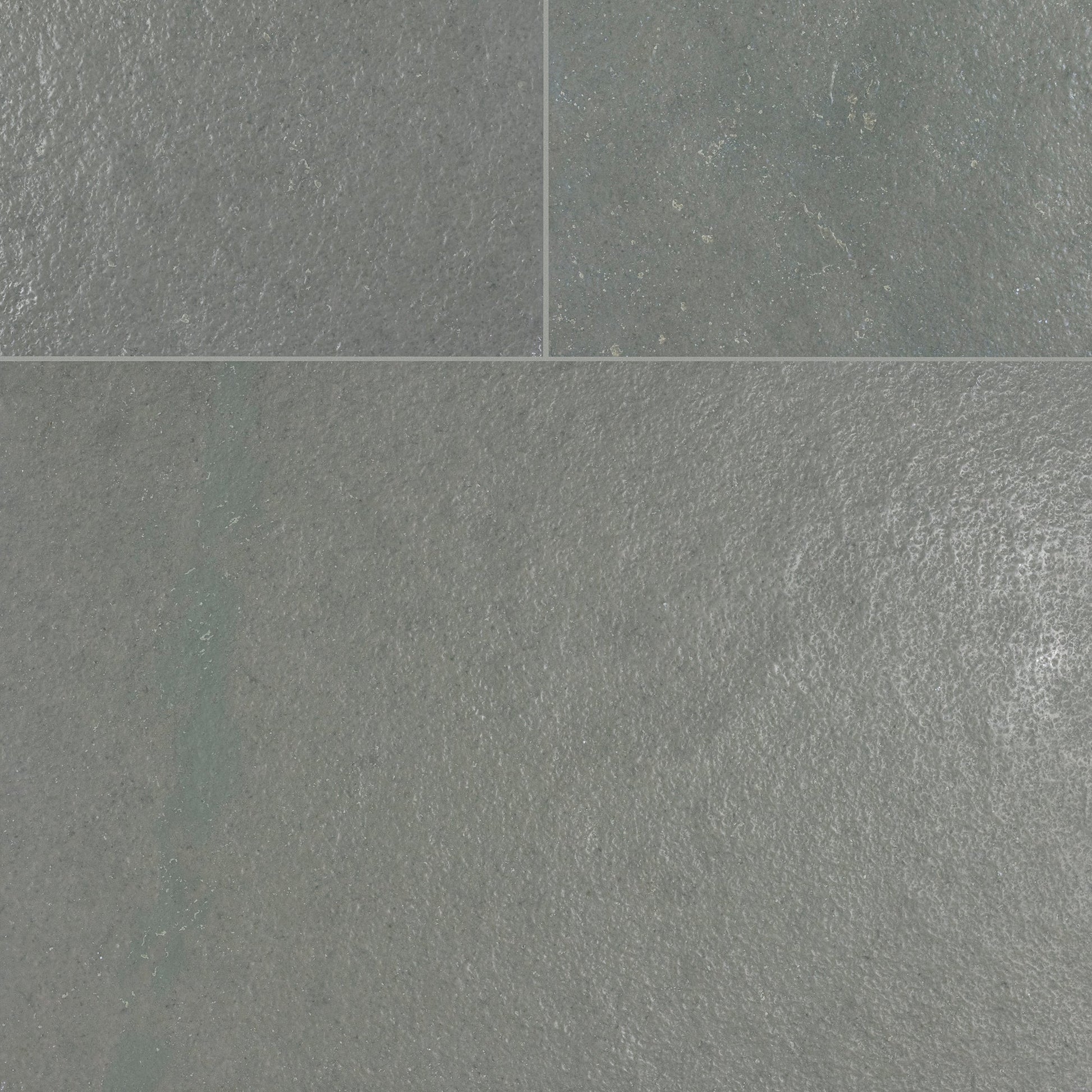 Lake Blue's dusky blue-grey-green coloring evokes stormy lake waters, or a deep ocean vista from high above. The beauty of this stone lies in the subtle variance in color from one tile to the next.  Stocked in straight-edged 16" x 24" field tile with a brushed finish, reminiscent of ripples on water.