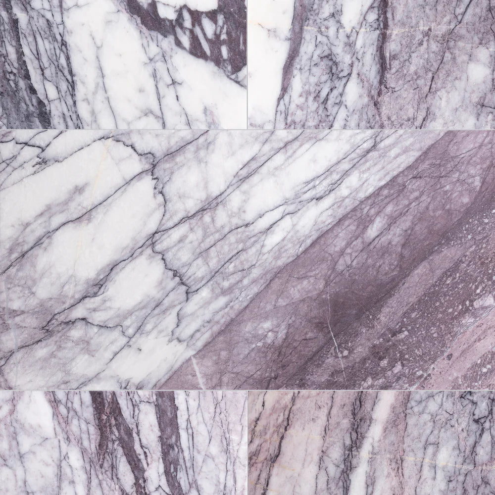 A clean white marble dramatically streaked with plum colored veining, Lilac is a beautiful natural stone with purple personality. Stocked in a variety of field tiles, liners, mosaics and slabs.