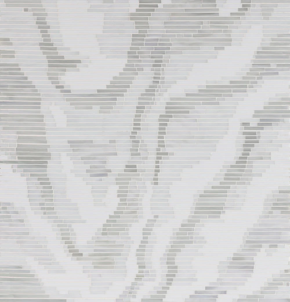 Based upon the textile pattern known for its subtle ripples of tonal shading, Moire, often called the “watered textile,” is traditionally achieved by pressing two damp fabric layers with a pattern-engraved roller, resulting in a unique, wavy texture. Mississippi Moire arranges hand cut pieces of Jazz Glass in a meticulous staggered repeat. This closely spaced yet imperfectly aligned arrangement creates a mesmerizing, watercolor effect, in a visual allusion to the classic moire fabric treatment. Available in two exquisite color combinations, Pink Lady and Ice White, Mississippi Moire transforms into an all-over mosaic with seamless interlocking sheets.