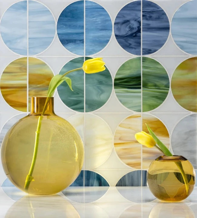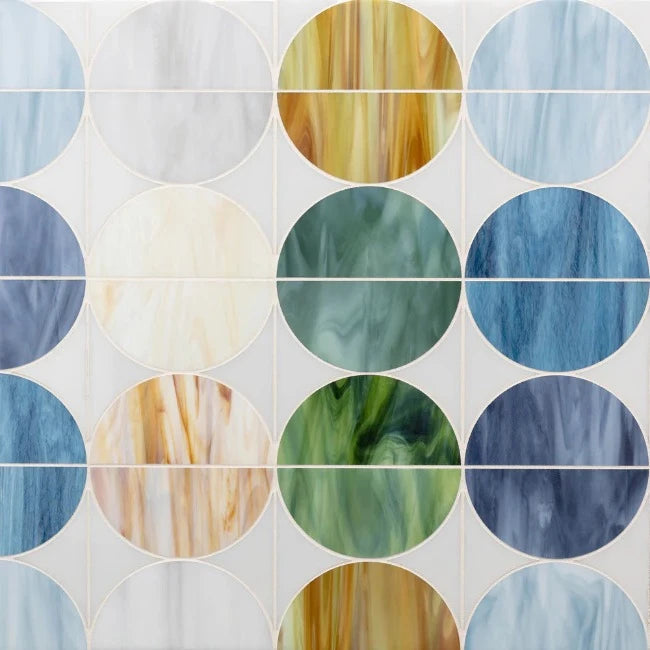 Made in-house by Artistic Tile’s artisans minutes from midtown Manhattan, the Made in America Tailored To Collection is highly customizable to your unique requirements. A complex pattern of bisected circles crafted in vibrant, glowing Jazz Glass. Presented in Light Multi and Dark Multi options.
