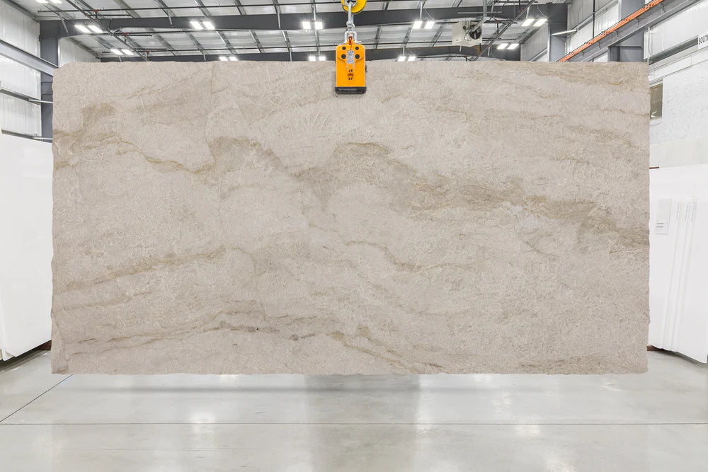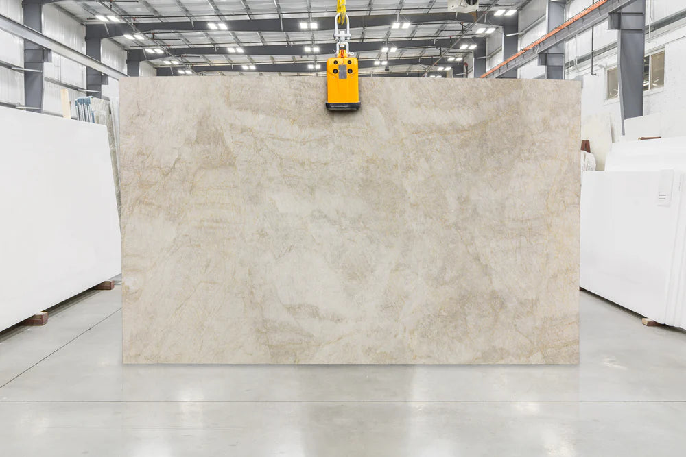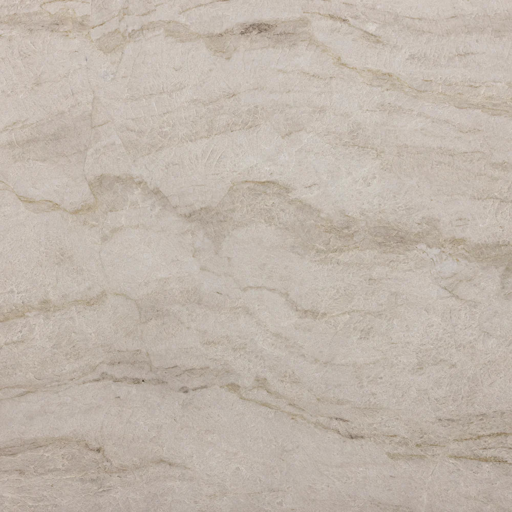 A khaki-and-cream quartzite with subtle gold veining. Naica quartzite is quarried in Brazil and stocked in 2 and 3 cm leather, 3 cm polished and 2 cm honed slabs