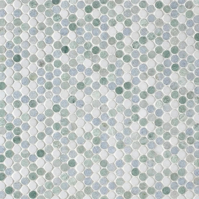 Simultaneously fresh and retro, the applications for these penny round stone mosaics are limitless. Circular tiles are a staple of residential and commercial design; our Studs are unique in their smaller size and our use of classic stone in their creation. A traditional yet relaxed aesthetic.