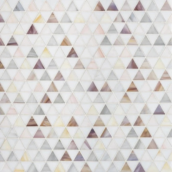 A random, hand-assembled arrangement of colored art glass triangles creates a harmonious blend in Trombone Triangles, part of our Jazz Glass collection. Each of the two colorways, Pink and Blue, include a variety of colors set against white, creating an overall pink or blue effect. Closer inspection reveals the complexity of the pattern, with colors swirling throughout each of the multi-tonal pieces that compose the mosaic. Suitable for all wet areas and walls, and light traffic residential floors.