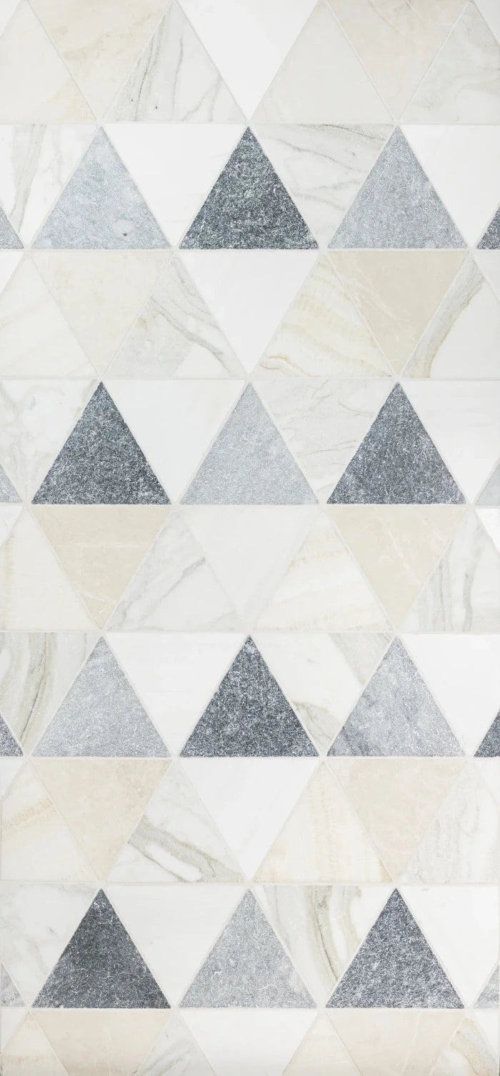 A versatile collection of nominal 11" tumbled triangular stone tiles sold individually in a selection of six different stone varieties, these equilateral triangles are great building blocks for a truly unique space. Choose from Bianco Dolomiti, Calacatta Gold, White Sand, Afyon Grey, Nero, or Vanilla Onyx, and craft your own story. Notable for slightly soft edges and subtly rounded corners, these Tumbled Triangles have an understated natural aesthetic that feels right at home.