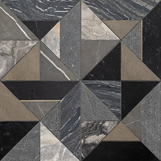 Westwind’s bold geometry features fascinating blends of stone cut into a mosaic of triangles and bisected pyramids. Rich and dark, Westwind Black is comprised of honed Grey Foussana limestone and Grafite, Arabescato Orobico, and Silverwave marbles, amplified by the inclusion of textured Nero marble and linear brass accents. Westwind Lilac offers a sophisticated mix of Bianco Dolomiti, Lilac, Calacatta Gold and Bianco Carrara marbles and Cloud limestone, all honed, plus textured Bianco Carrara, with brushed stainless steel as accent.
