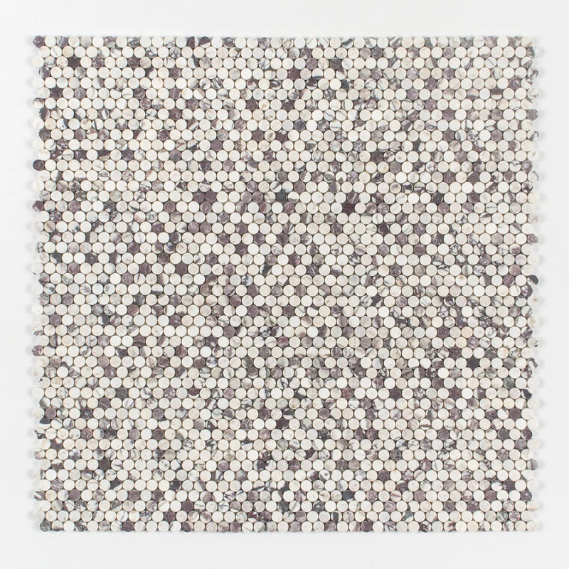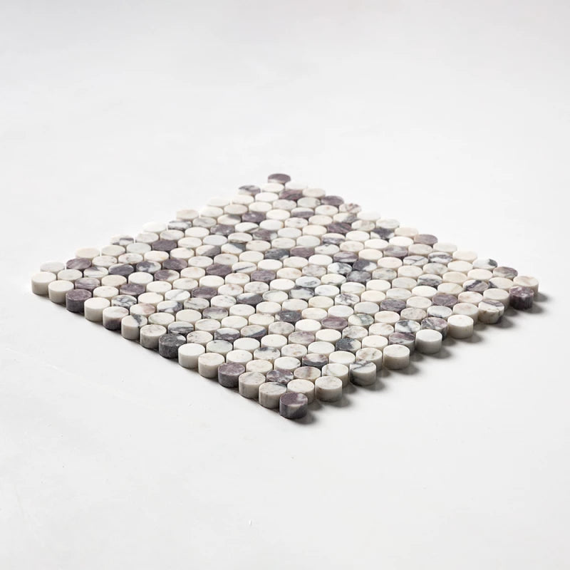Elevate your space with the Calacatta Viola Honed Penny Round Marble Mosaic. Mosaic tiles are an excellent choice for homeowners and business owners who want to make a bold statement on in their kitchens, bathrooms and living spaces. Marble mosaics are a time-tested material that have been used in buildings of the world's most prestigious locations for centuries. Marble mosaics provide luxury and exclusivity to any home by adding rich textures, patterns, and endless decor possibilities. 404