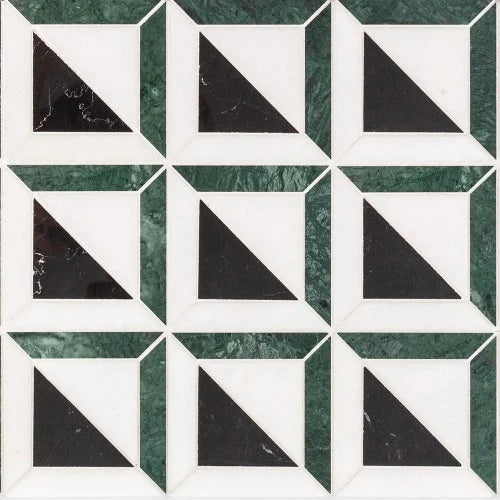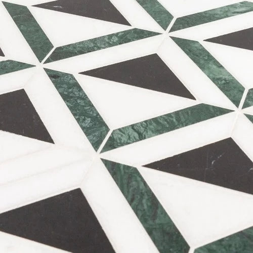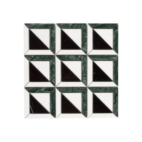 Give your space an art deco look and a little color with the Triangoli mosaic. This mosaic features a blend of black, white, and green marble with a combination of matte and gloss finishes. Triangoli mosaic's pattern is comprised of triangles and trapezoids creating color-blocked squares, giving the mosaic its unique art deco style. This mosaic is perfect for creating stylish spaces including bathrooms and showers. 206